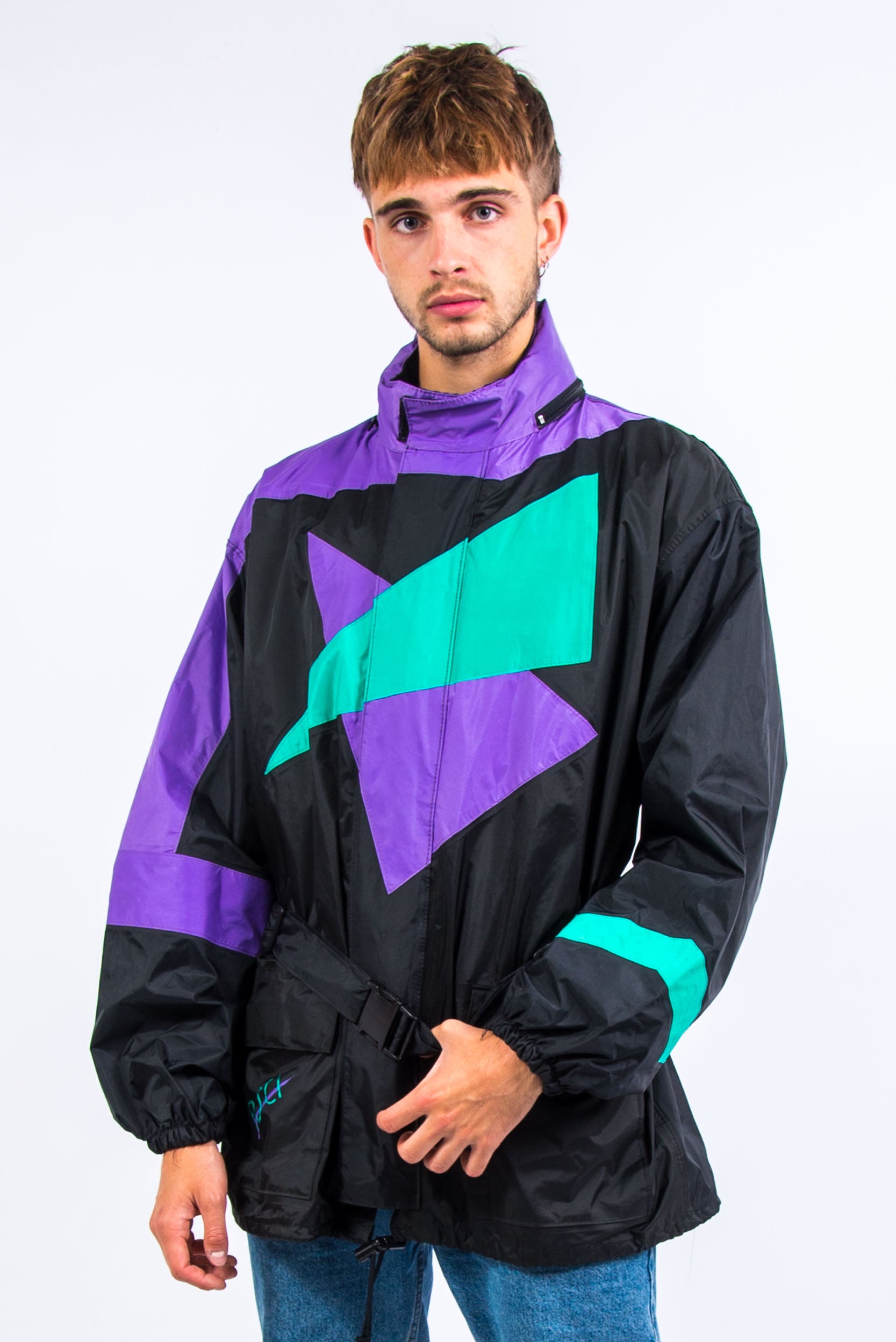 90's vintage colour block waterproof rain jacket with cord collar and belted elasticated waist. Also has zip away hood.