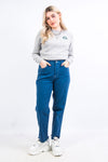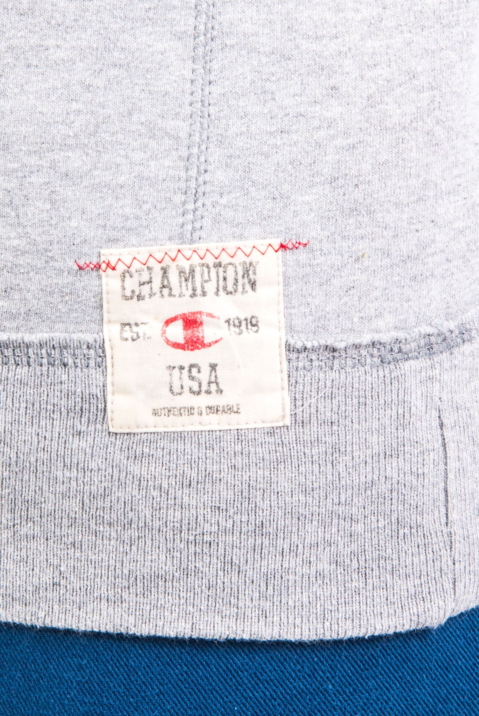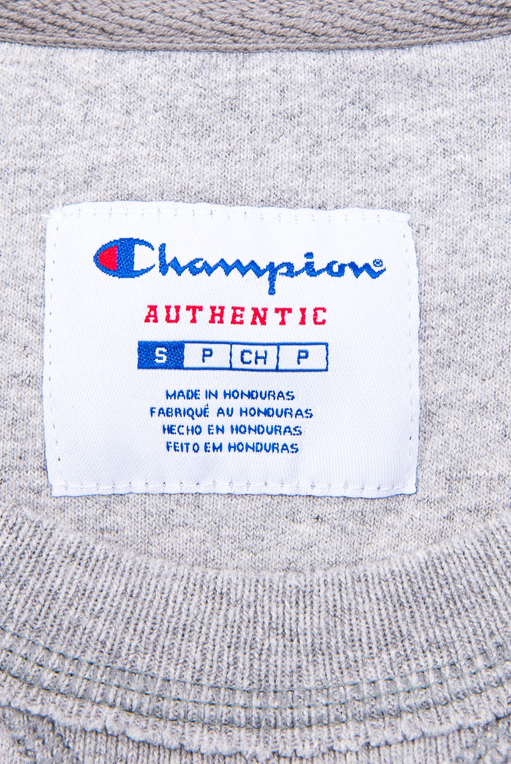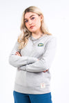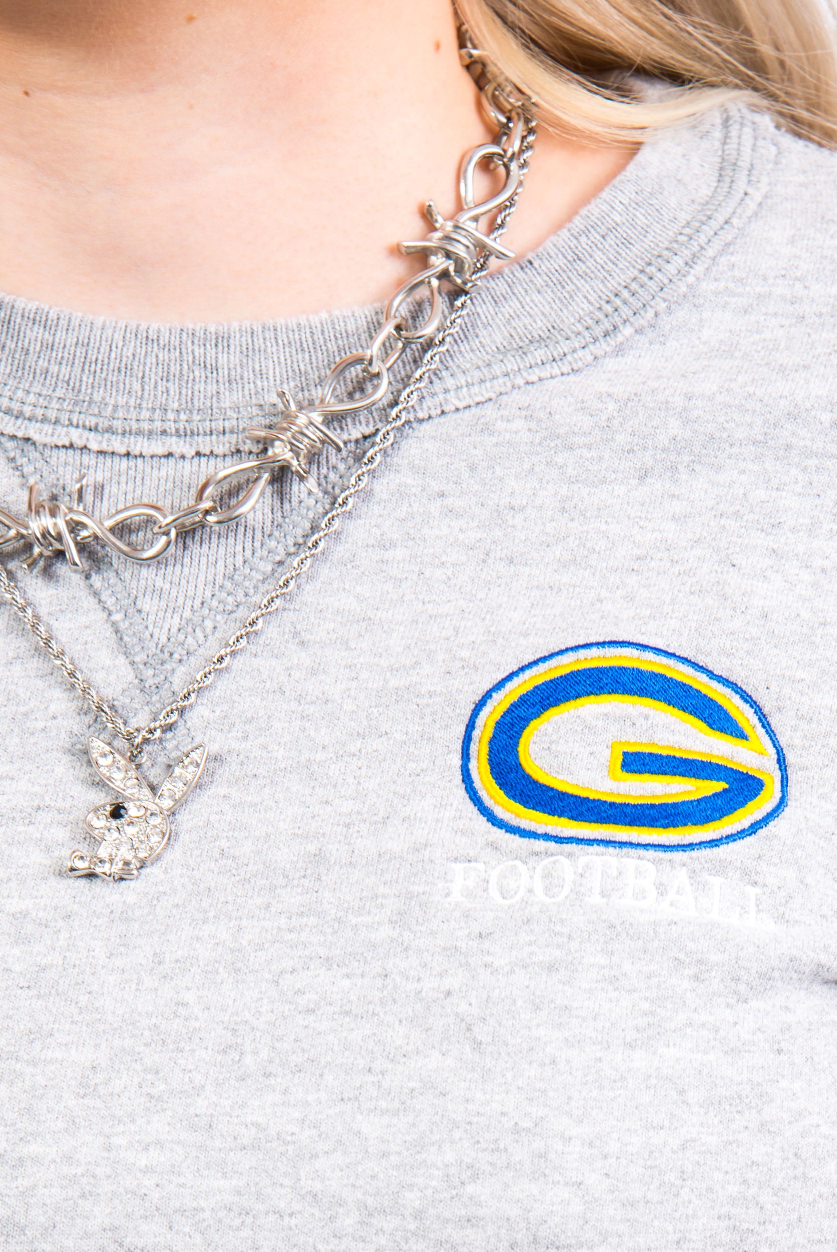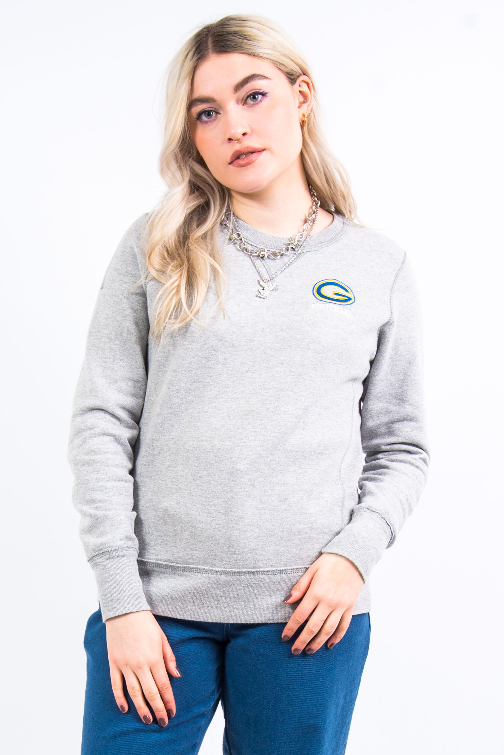 Vintage grey Champion sweatshirt with embroidered college logo and 'Football' on the front upper.