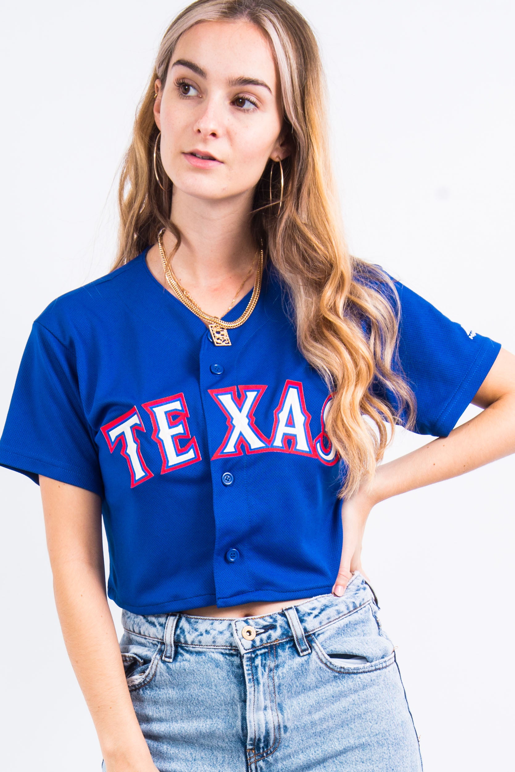 Vintage Texas Rangers blue and red baseball jersey shirt with '#1 Banner' text on the back.