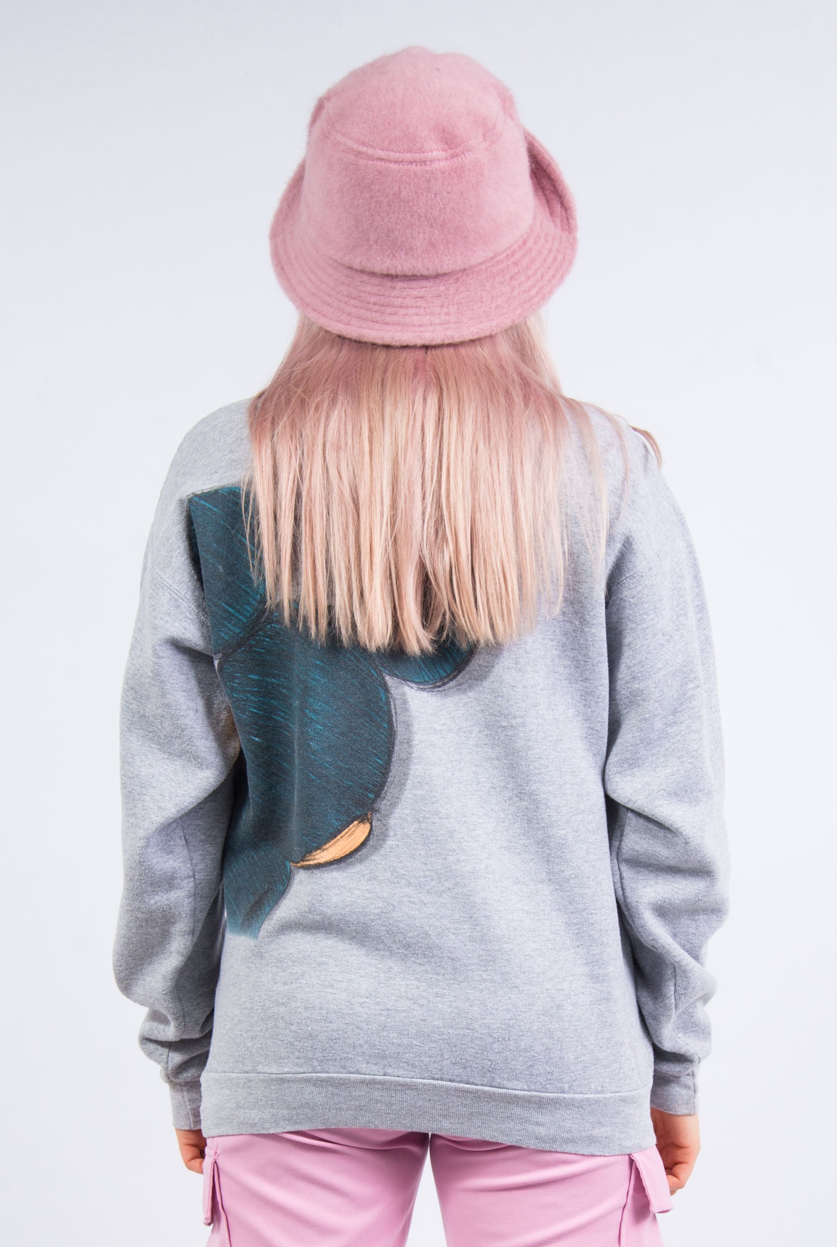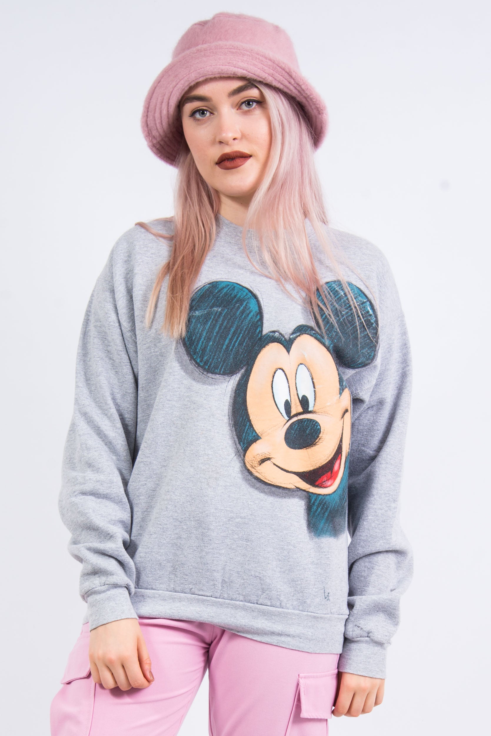 Vintage grey Disney sweatshirt with Mickey Mouse graphic on front and back. SWEATSHIRT HAS PAINT MARKS ON THE BACK OF ONE SLEEVE (SEE PICS).