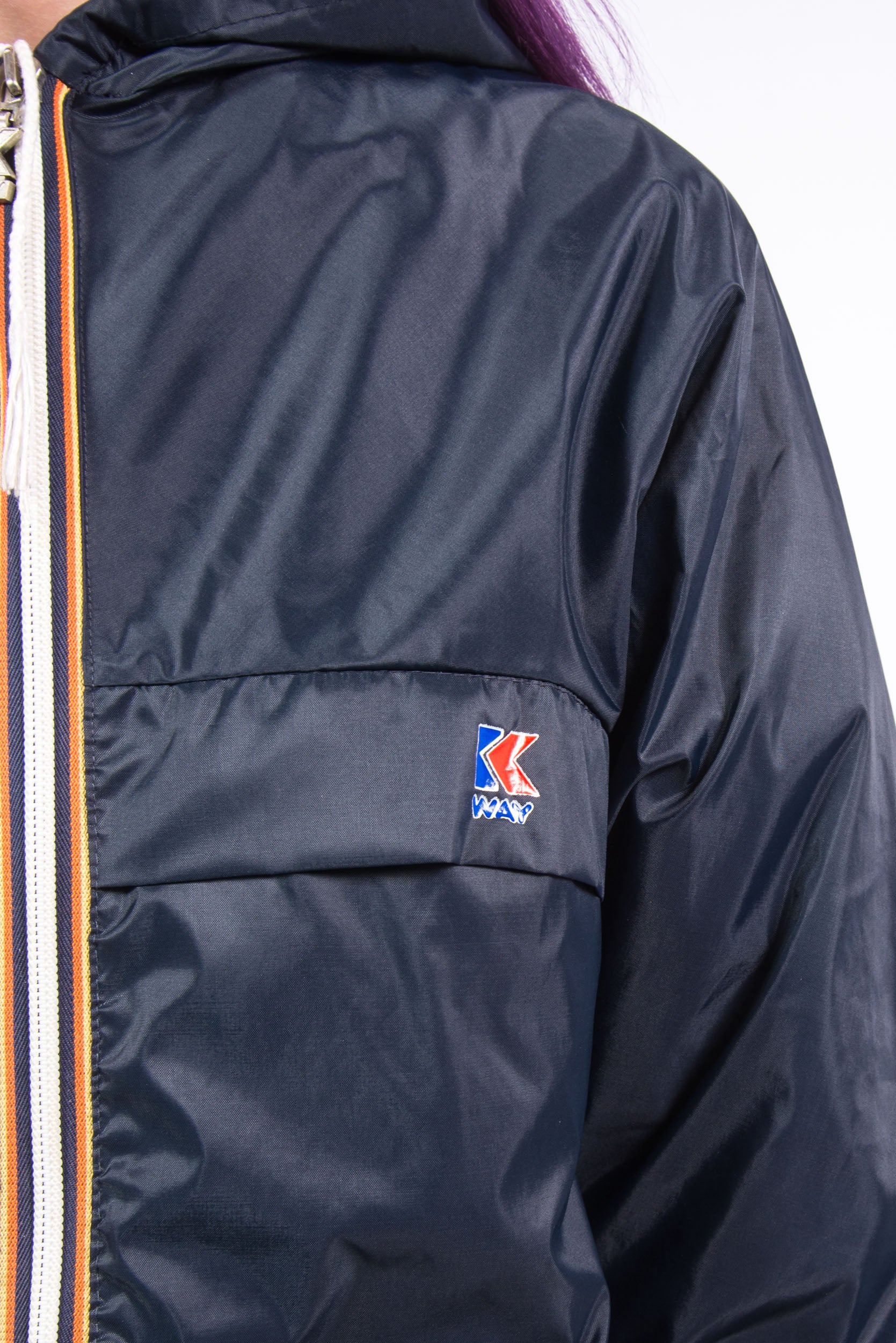 Vintage navy blue hooded K-Way cagoule raincoat with logo on front upper.