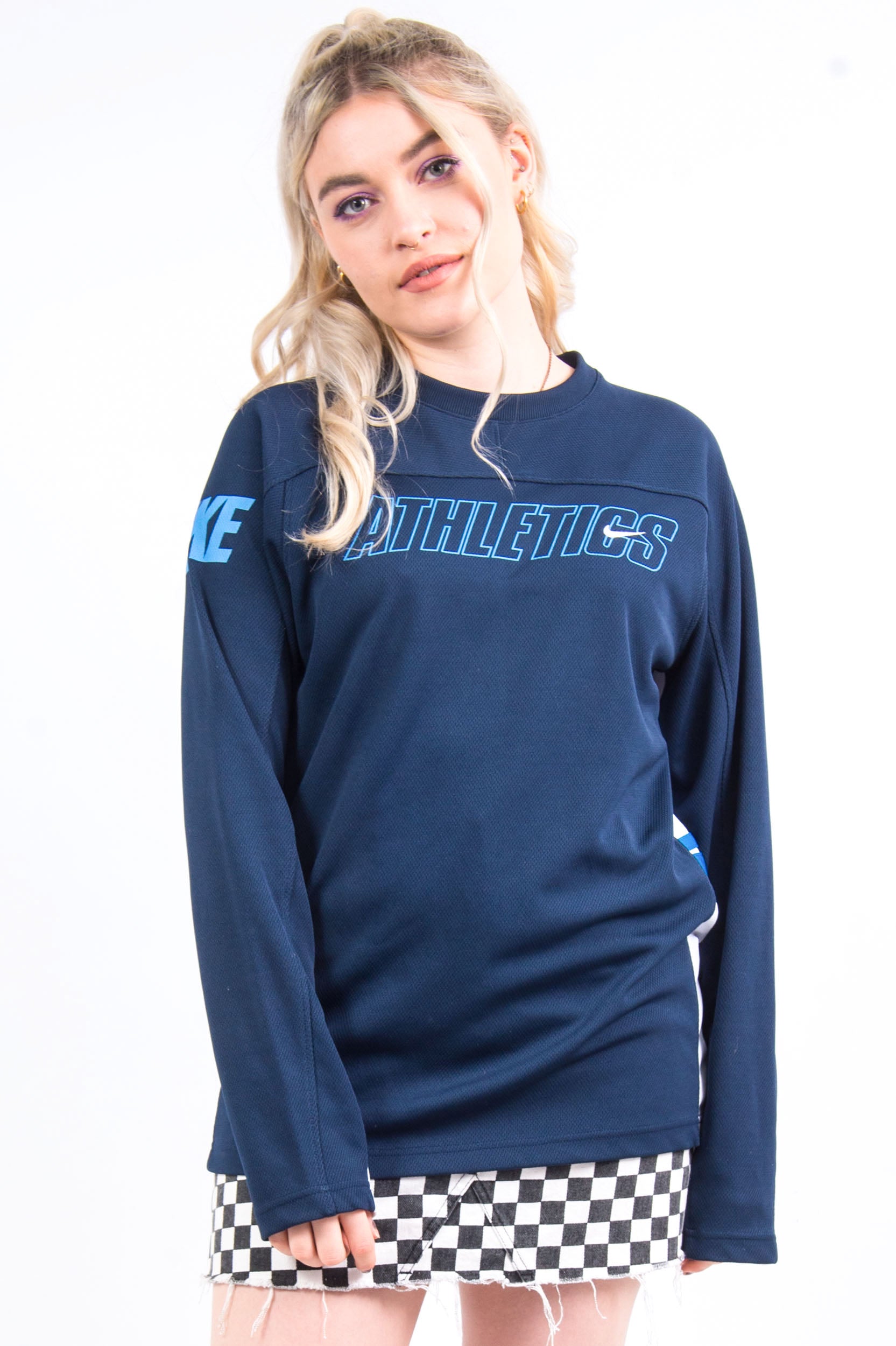 Vintage Nike long sleeve sports t-shirt with 'Athletics' text and embroidered Swoosh on the front.