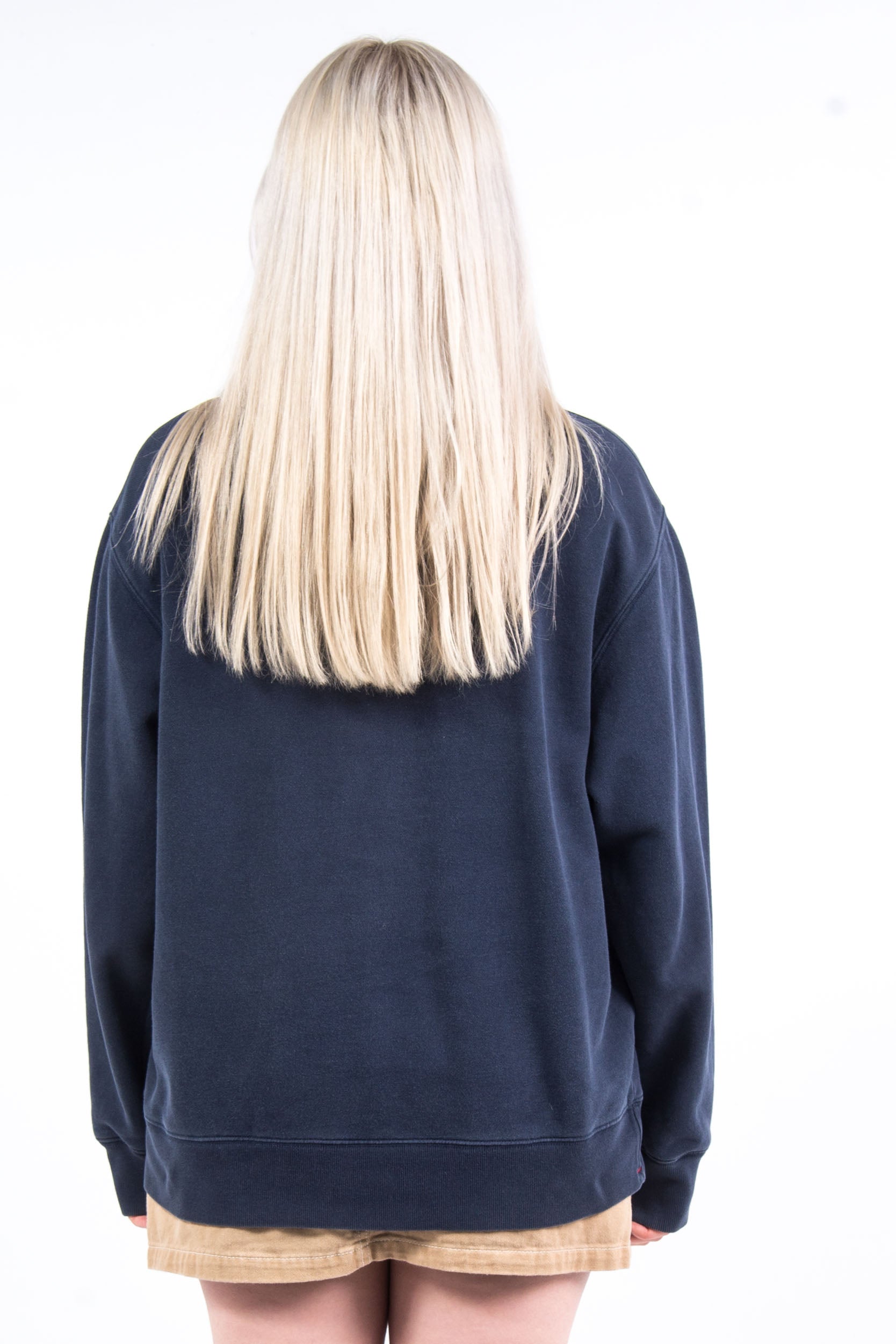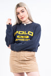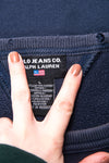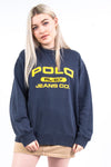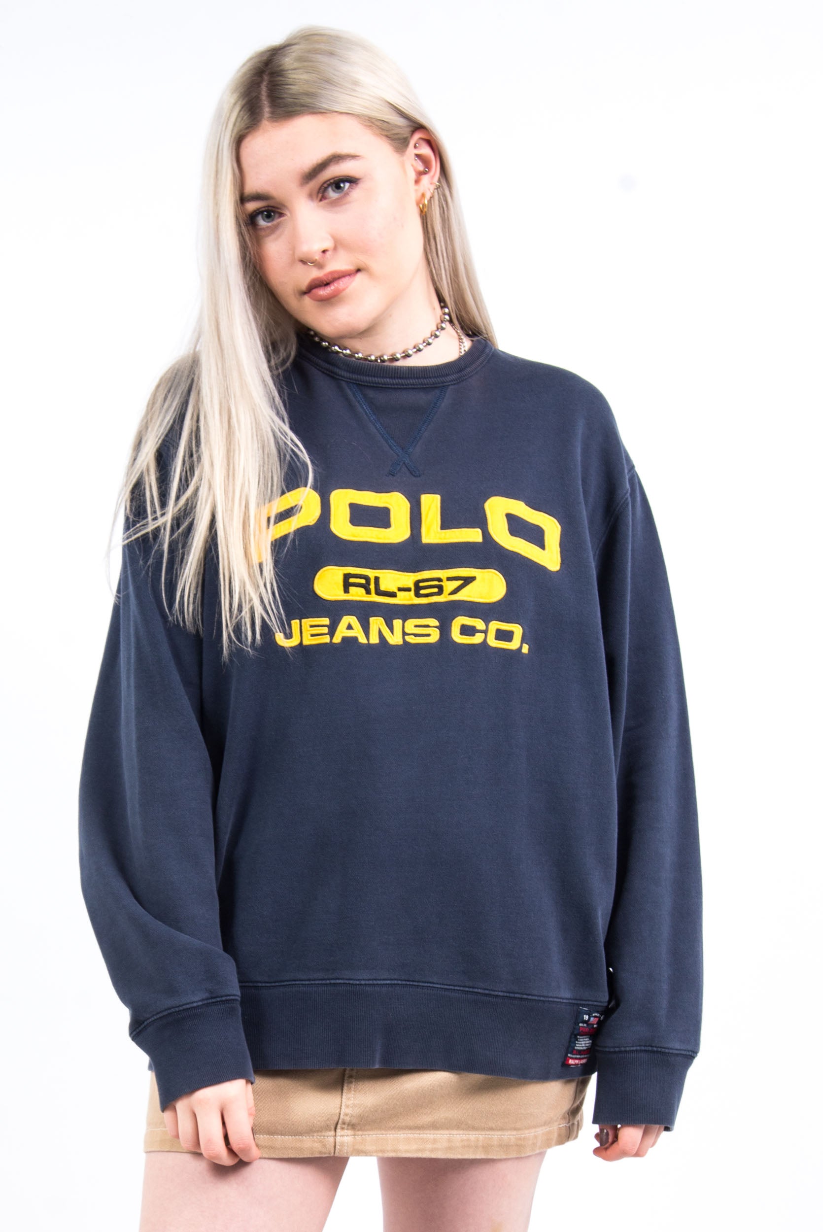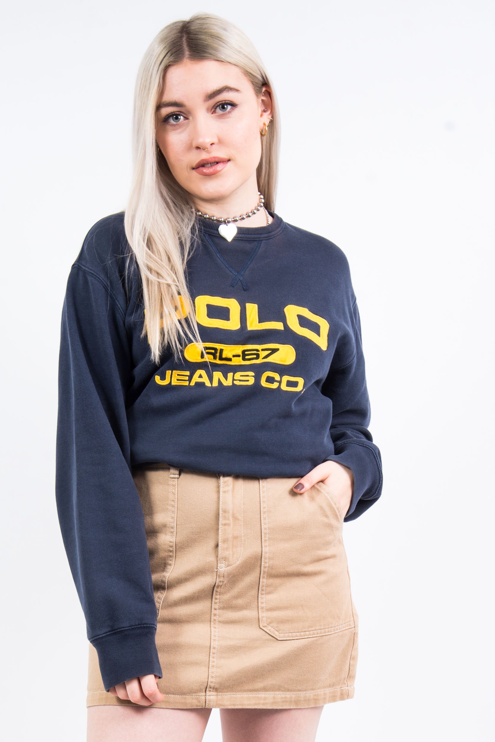 Vintage Ralph Lauren Polo Jeans Co. navy sweatshirt with yellow embroidered text on the front. SWEATSHIRT HAS LIGHT WEAR TO THE BACK OF THE INNER NECKLINE (SEE PICS) VERY MINOR.