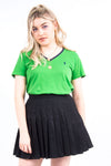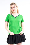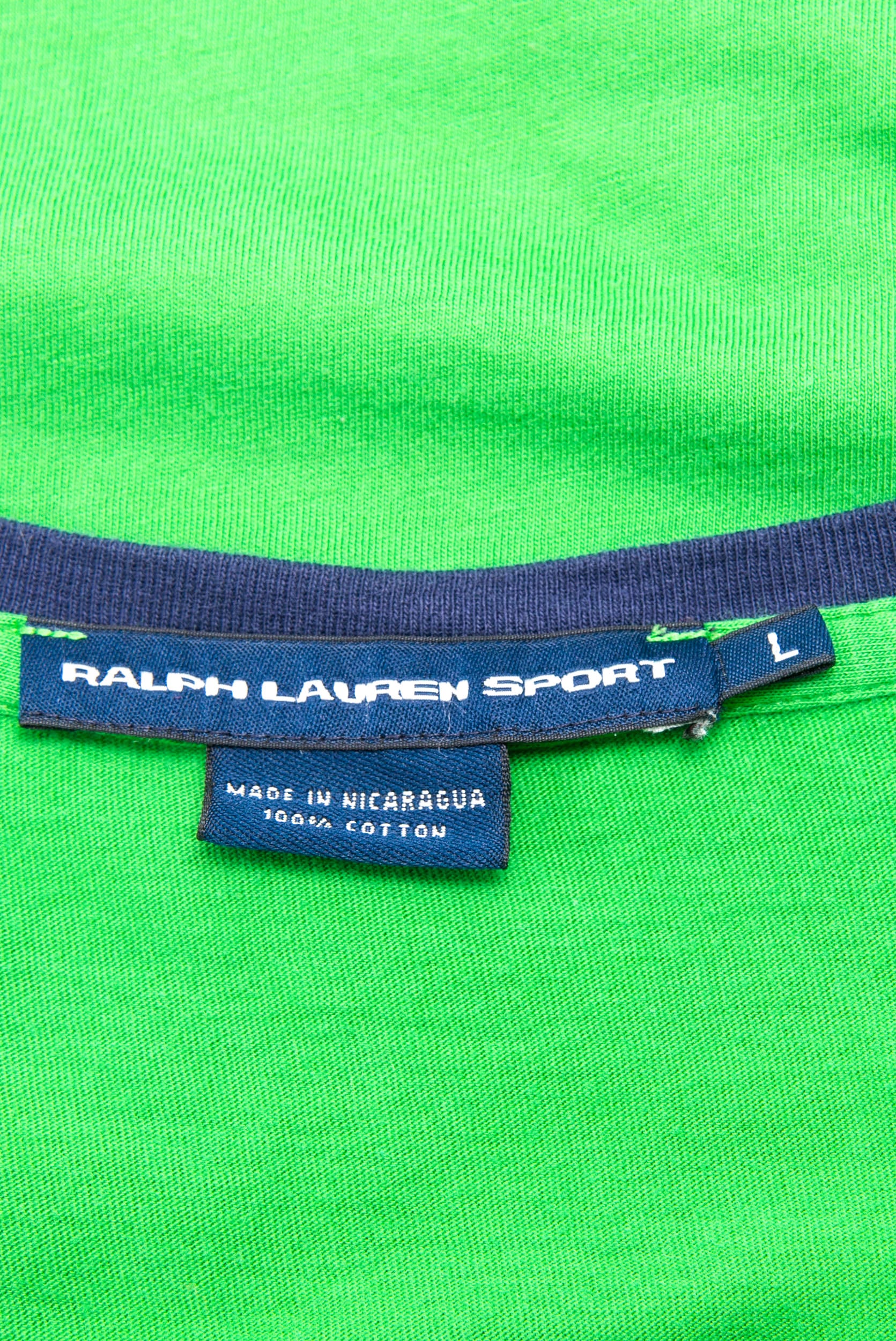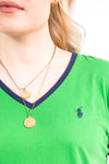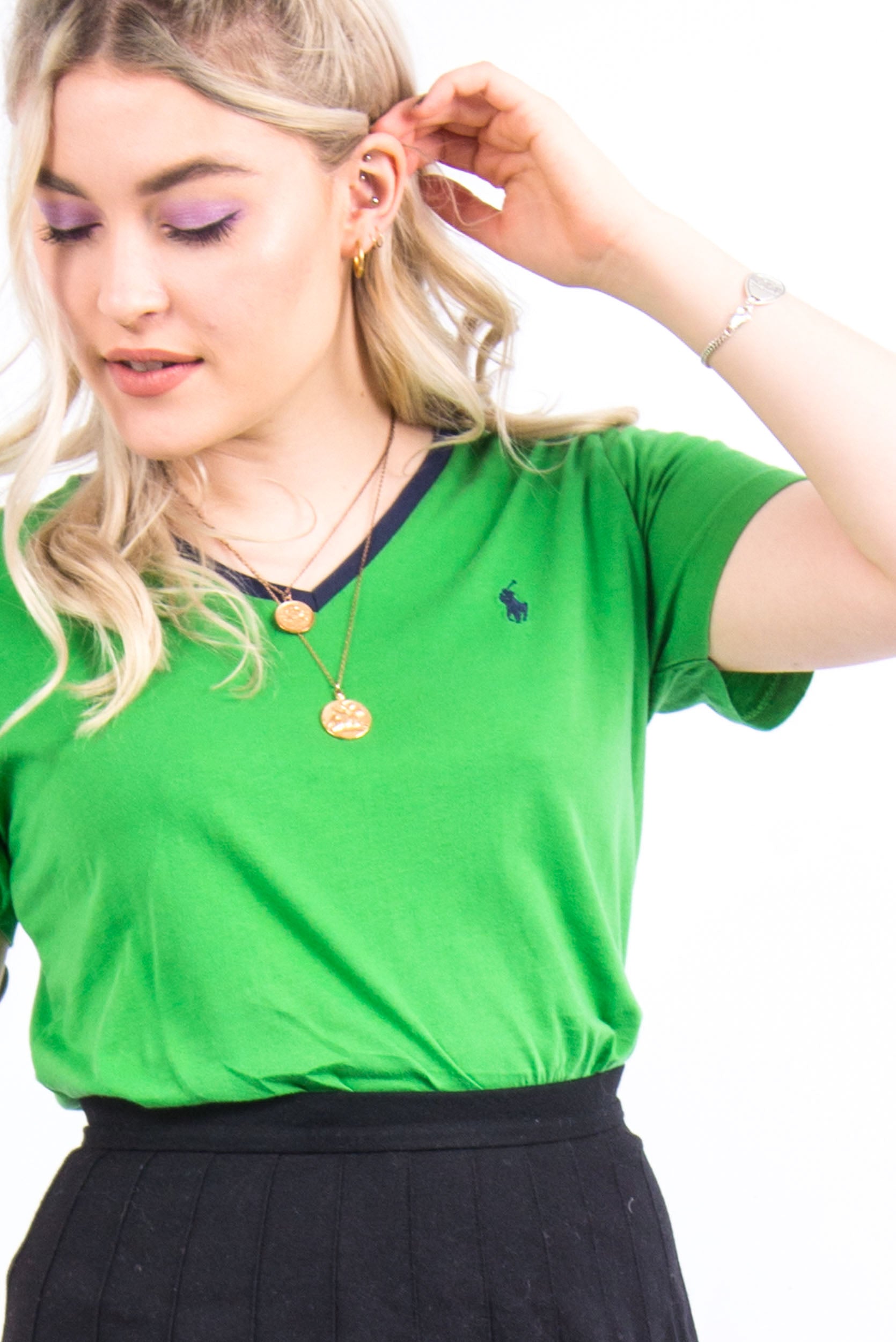 Vintage Ralph Laurengreen and navy blue v-neck t-shirt with embroidered logo on front upper.